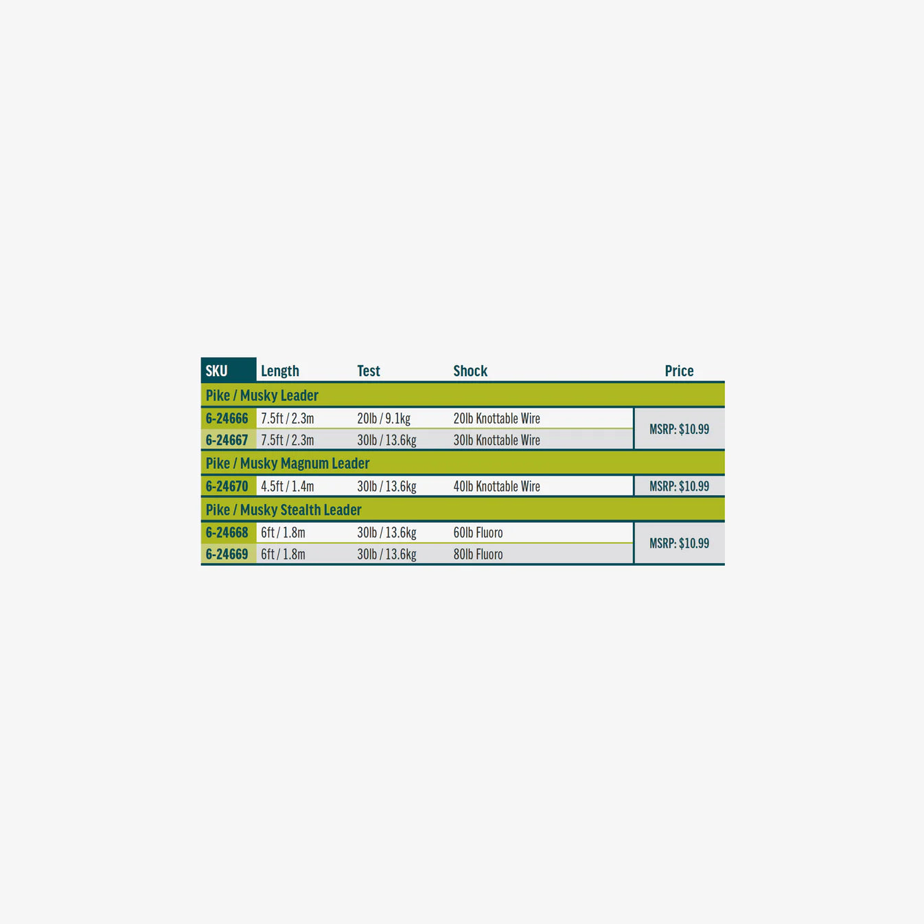 - Pike / Musky — 7.5 foot, 20lb and 30lb knottable wire options featuring a twist clip tied to the end for easy and quick rigging.
